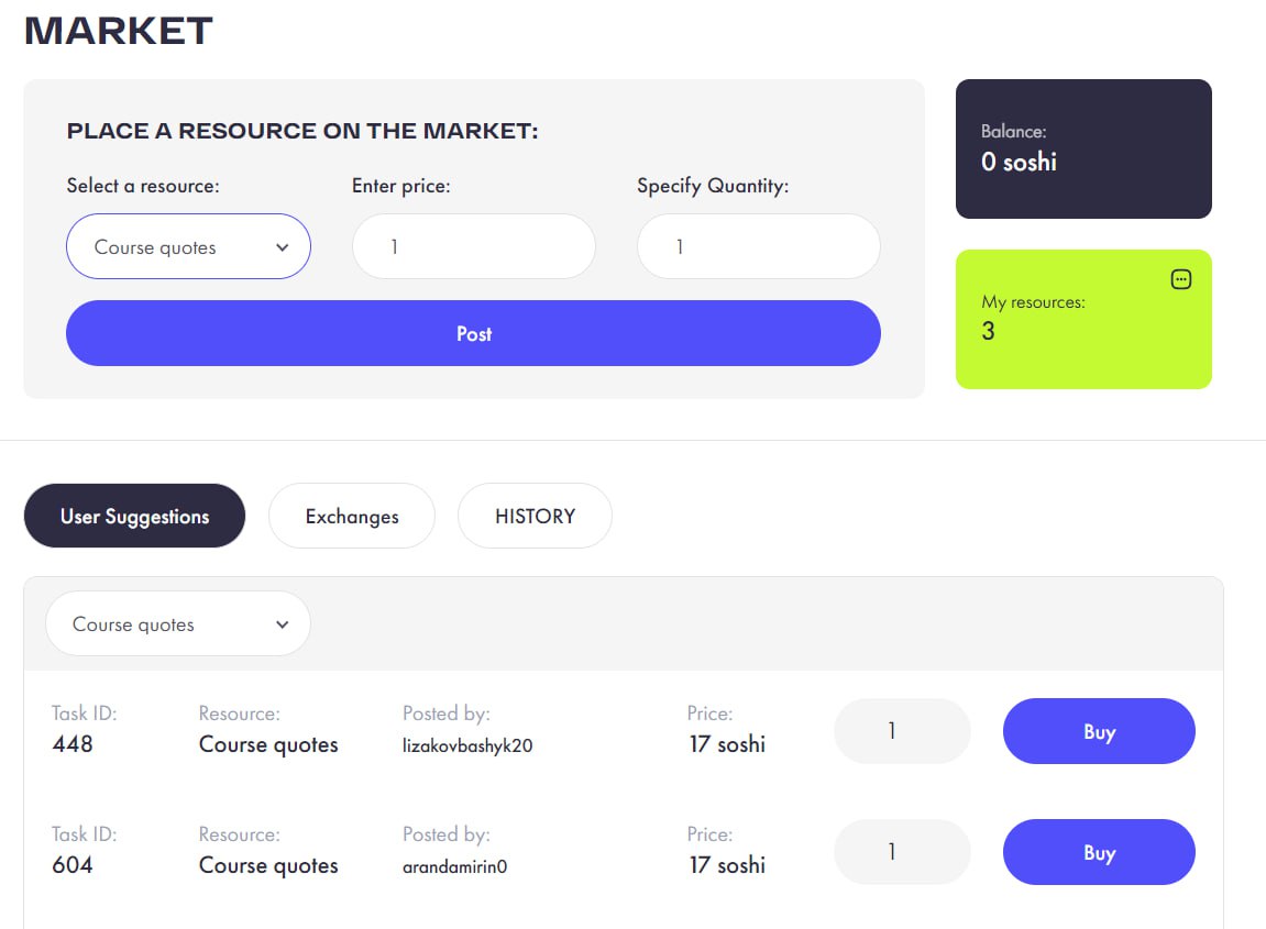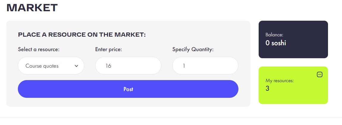 Рынок делится на: Общий рынок среди участников и Биржу системы - Общий рынок предназначен для основной торговли покупки и продажи ресурсов, Биржа служит при дефиците продуктов на рынке и ориентир ценовой политики для конкуренции.